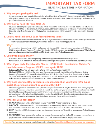 You will receive a Form 1095-A if you or someone in your household had qualifying coverage through Access Health CT. If someone in your household had HUSKY Health (Medicaid or Children’s Health Insurance Plan (CHIP)) coverage in the previous plan year, they can request a form called a Form 1095-B from the Connecticut Department of Social Services (DSS). You should expect a Form 1095-C if you had coverage through your employer or through Medicare. If you have questions, please contact your employer or the Centers for Medicare and Medicaid Services (CMS).